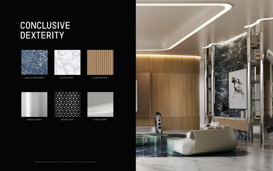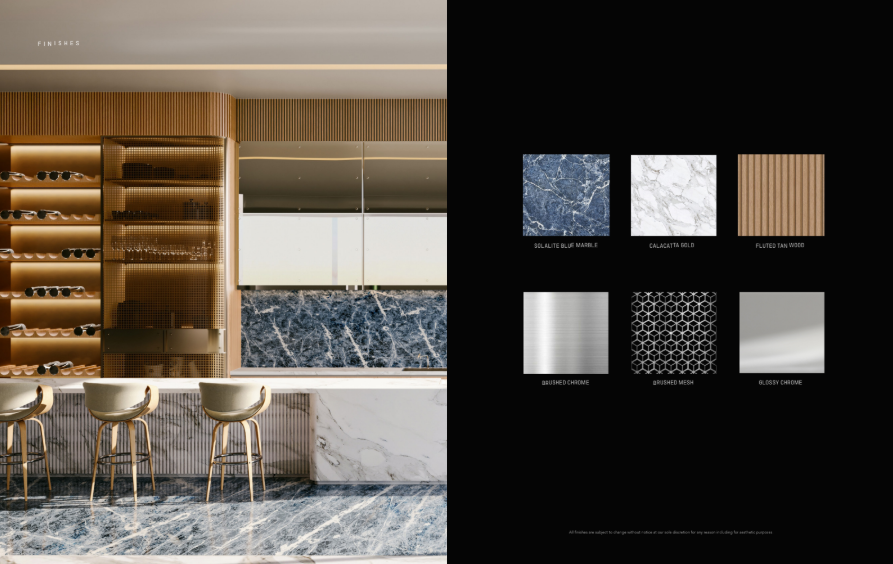 - Finishes: Examples of finishes include Sodalite Blue Marble, Calacatta Gold, Fluted Tan Wood, Brushed Chrome, Brushed Mesh, and Glossy Chrome.